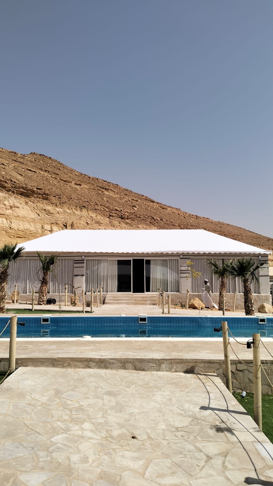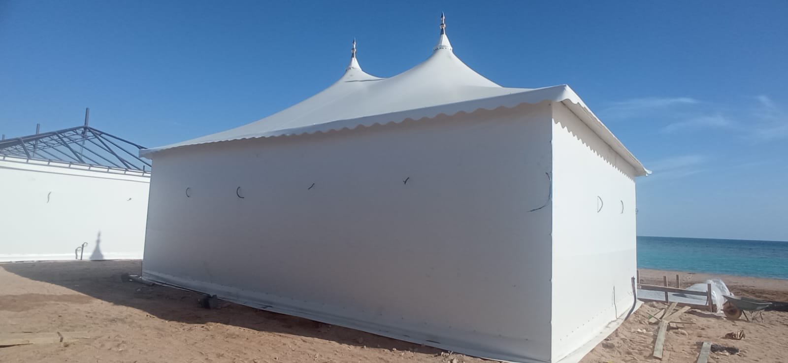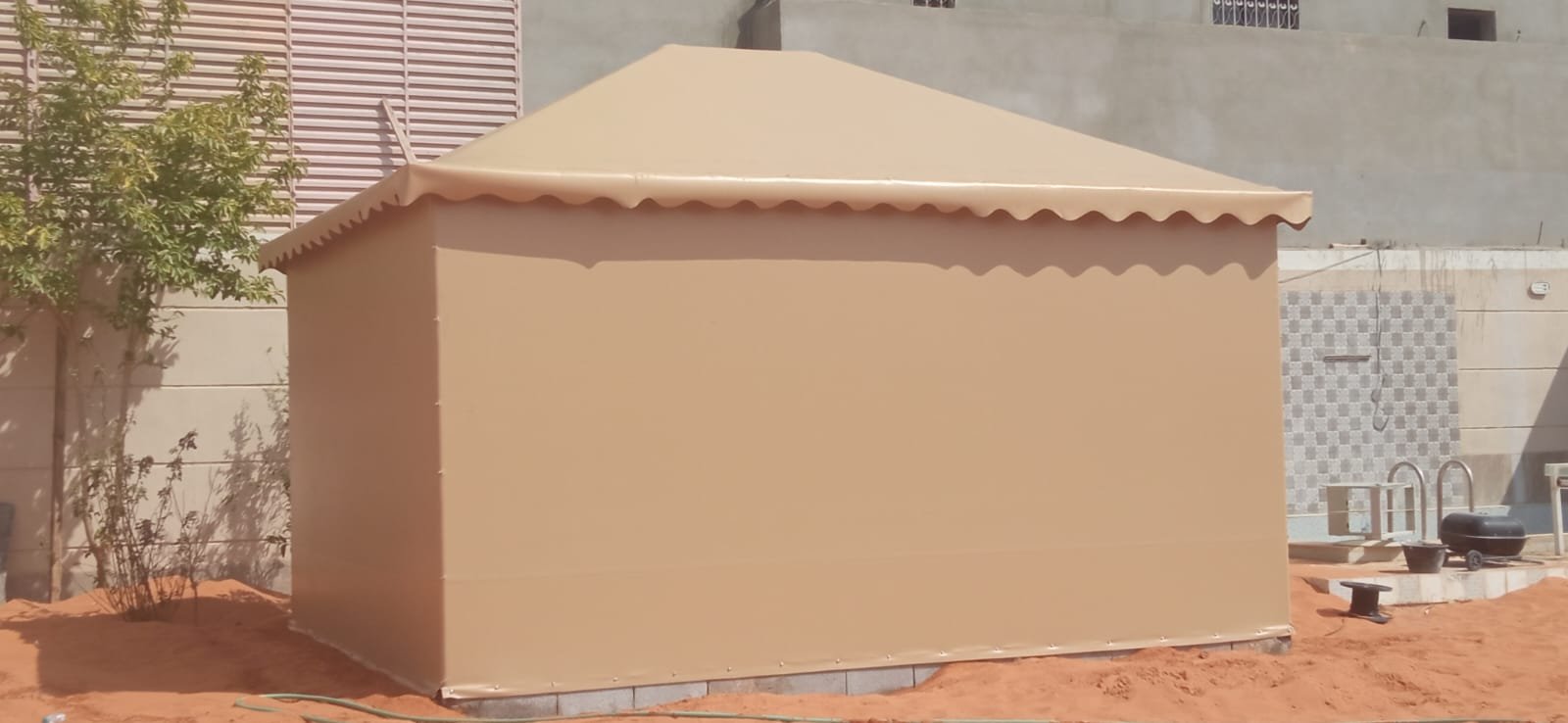 الخيمة عبارة عن هيكل قماشي يُستخدم بشكل مؤقت أو دائم، ويُصمم غالبًا من القماش المقاوم للعوامل الجوية، مع دعم معدني أو خشبي. تُستخدم في الفعاليات، الجلسات الخارجية، والضيافة المؤقتة.