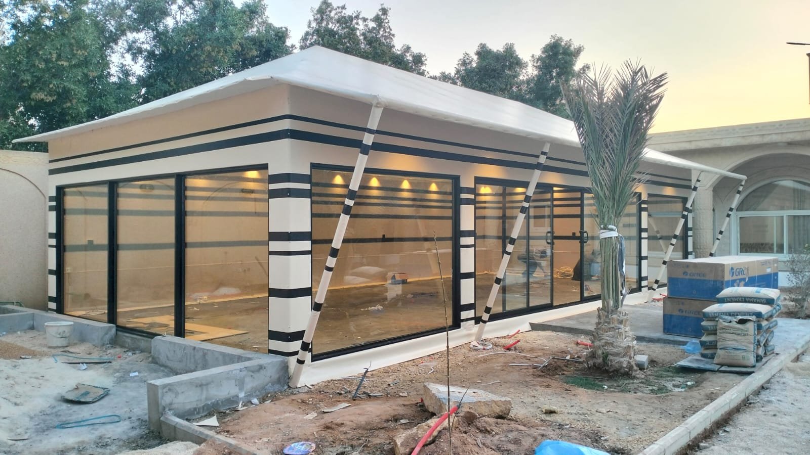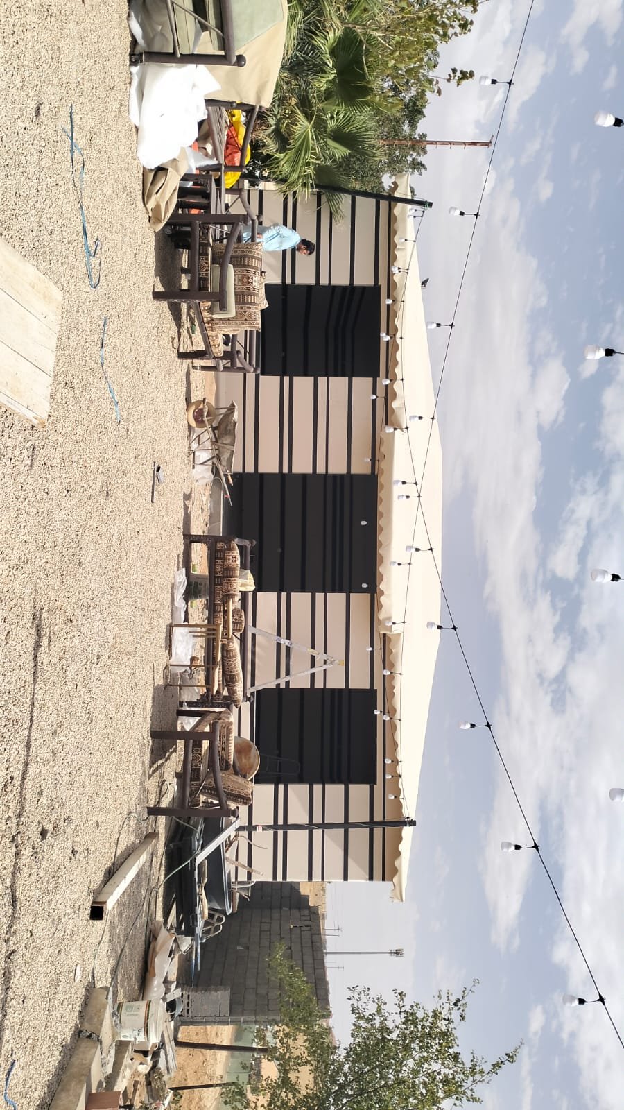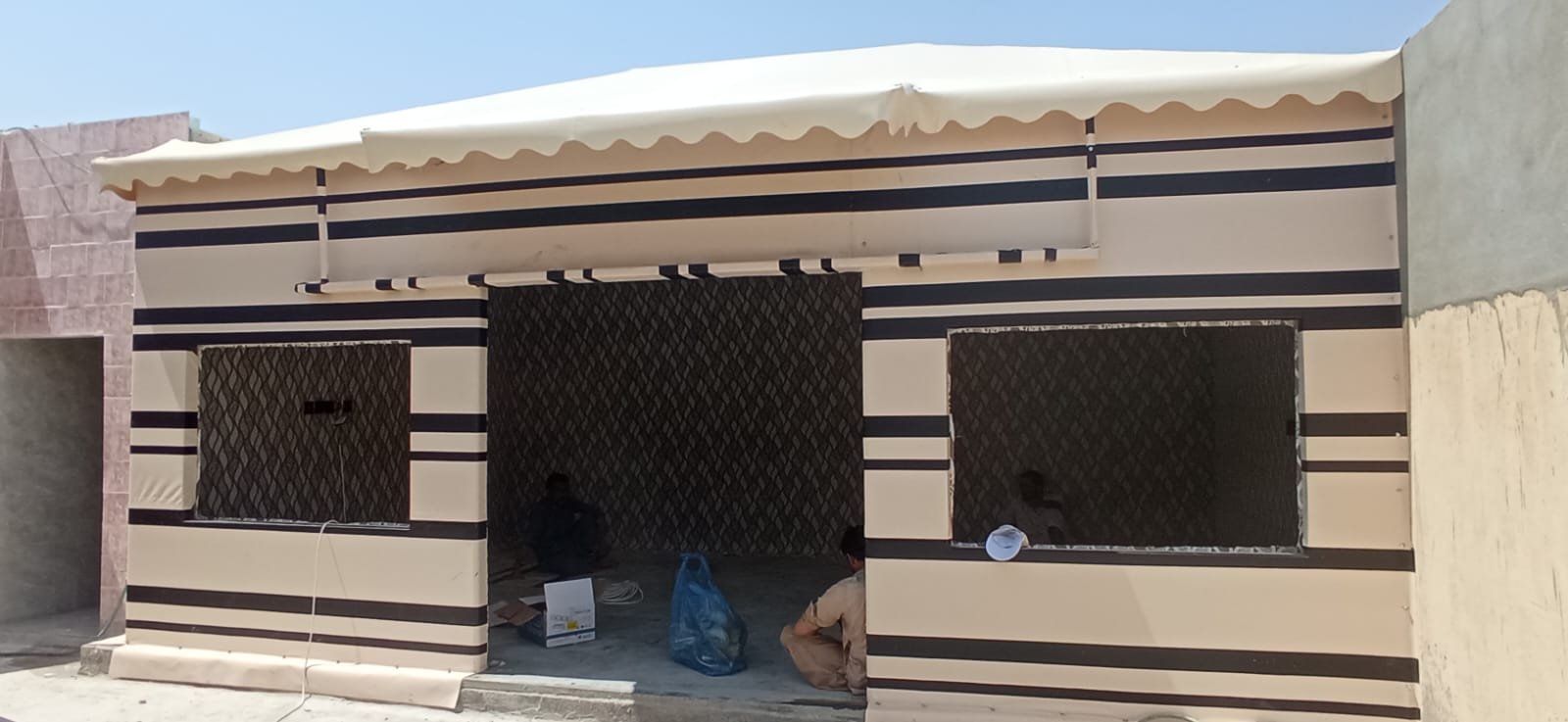 الخيمة عبارة عن هيكل قماشي يُستخدم بشكل مؤقت أو دائم، ويُصمم غالبًا من القماش المقاوم للعوامل الجوية، مع دعم معدني أو خشبي. تُستخدم في الفعاليات، الجلسات الخارجية، والضيافة المؤقتة.
