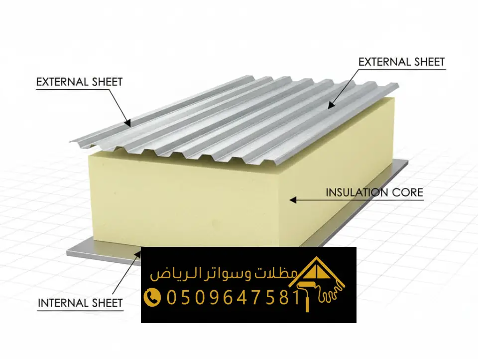 ايضا تتكون من طبقة داخلية من الحديد أو الصاج. هذه التركيبة تجعل الساندوتش بانل مادة مثل عازلة للحرارة بنسبة عالية وتكون مقاومة للرطوبة والمطر وهي خفيفة الوزن وسهلة التركيب. لهذا السبب انتشرت غرف ساندوتش بنل في الرياض باعتبارها أفضل بديل للبناء التقليدي المكلف والبطيء.